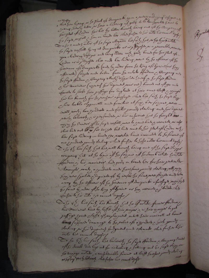 |Transcription=as Master shee then lyeing in the Port of dunquirke upon a merchandizing designe and | |Transcription=as Master shee then lyeing in the Port of dunquirke upon a merchandizing designe and | ||