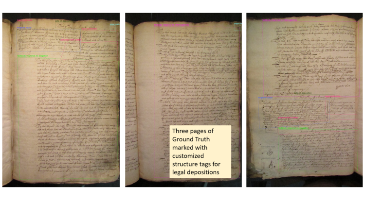 Three pages from our growing HCA 13/72 Ground Truth marked up with customized structural tags