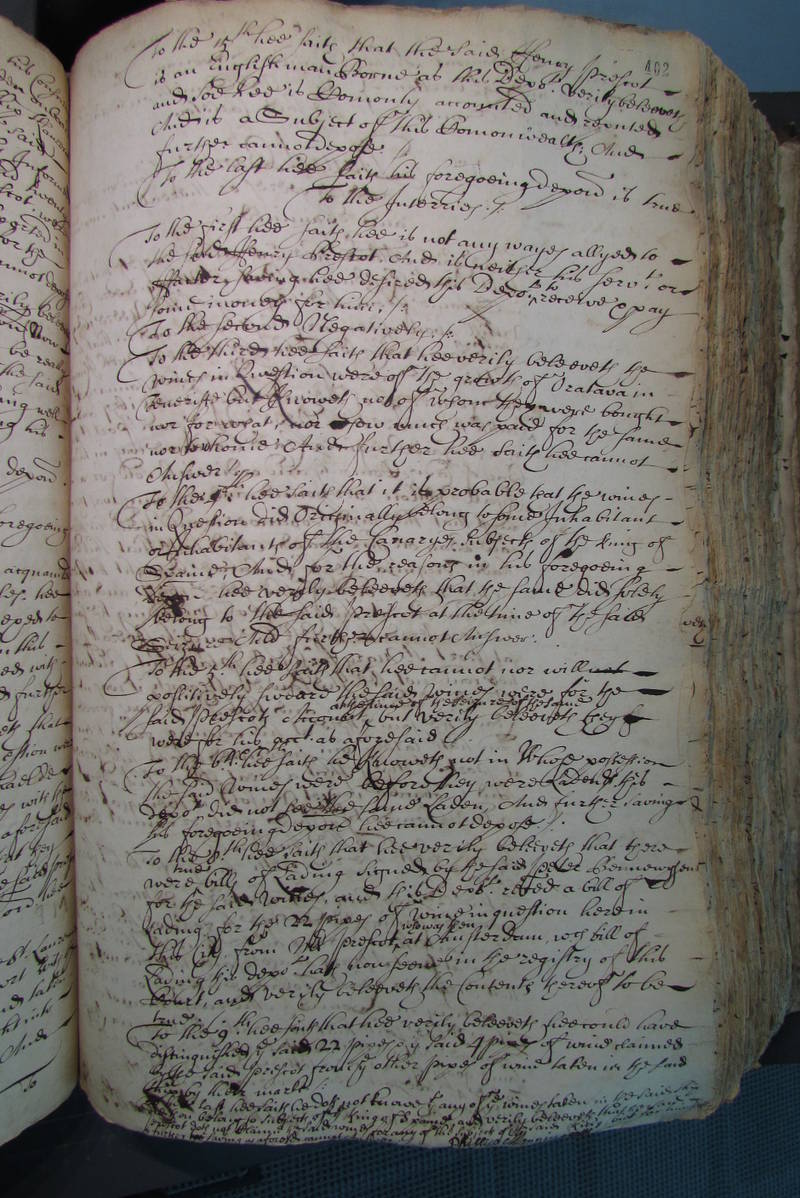 To the 8th hee saith that hee verily beleeveth that there<br /> were true bills of Lading signed by the said peter Bennewysen<br /> for the said wines, and this Deponent received a bill of<br /> Lading for the 22 pipes of wine in question herein<br /> this City, from Master prescot who was then at Amsterdam, which bill of<br /> Lading this deponent hath now seene in the registry of this<br /> Court, and verily beleeveth the Contents thereof to be<br /> true./.