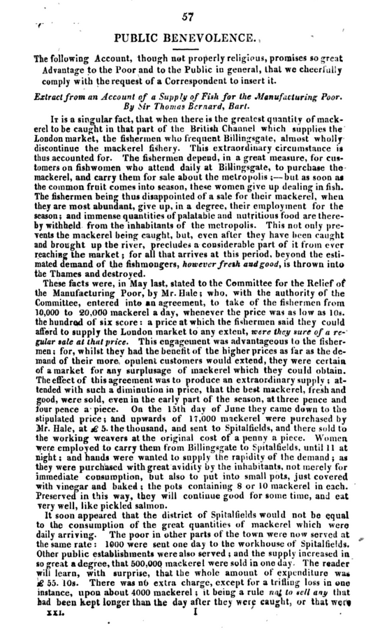 'Extract from an Account of a Supply of Fish for the Manufacturing Poor, by Sir Thomas Bernard, Bart.', in The Evangelical Magazine and Missionary Chronicle, vol. XXI (London, 1813), pp. 57-58
