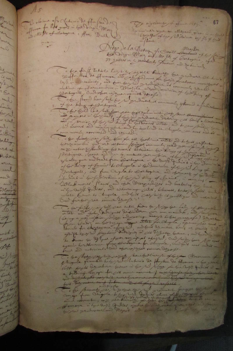 This Admiralty Court deposition documents the claim by Antonio da Fonseca da Franca over goods seized from the ship "Virgin Mary and All Saints of Cartagena." Antonio, a Portuguese subject, asserts ownership of the cargo, detailing his trade activities between Angola and the West Indies and the eventual seizure of his goods by a Commonwealth frigate. The case highlights issues of ownership, the legality of trade under permissions during wartime, and the rights of merchants in international waters.